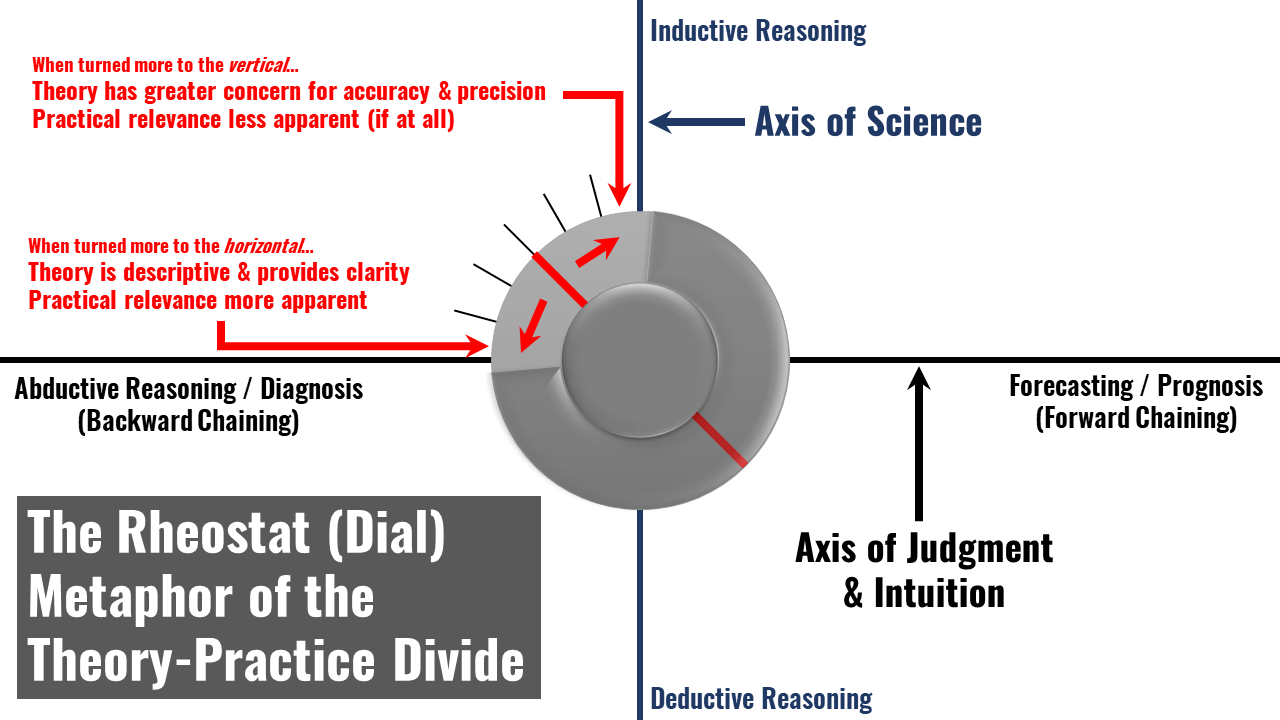 In this talk, I argue the latter — mainly that we are being misled by the very metaphors we use to describe the differences between theory and practice. I offer a different metaphor from the ‘gap.’ This alternative metaphor — that of the ‘rheostat’ — suggests some theories are simply not meant to be practical, but they are still good theories. Meanwhile, the inverse is also true in that certain matters of practice have little business being theorized. Below is a graphic, referenced in the episode, that shows how the rheostat metaphor works.